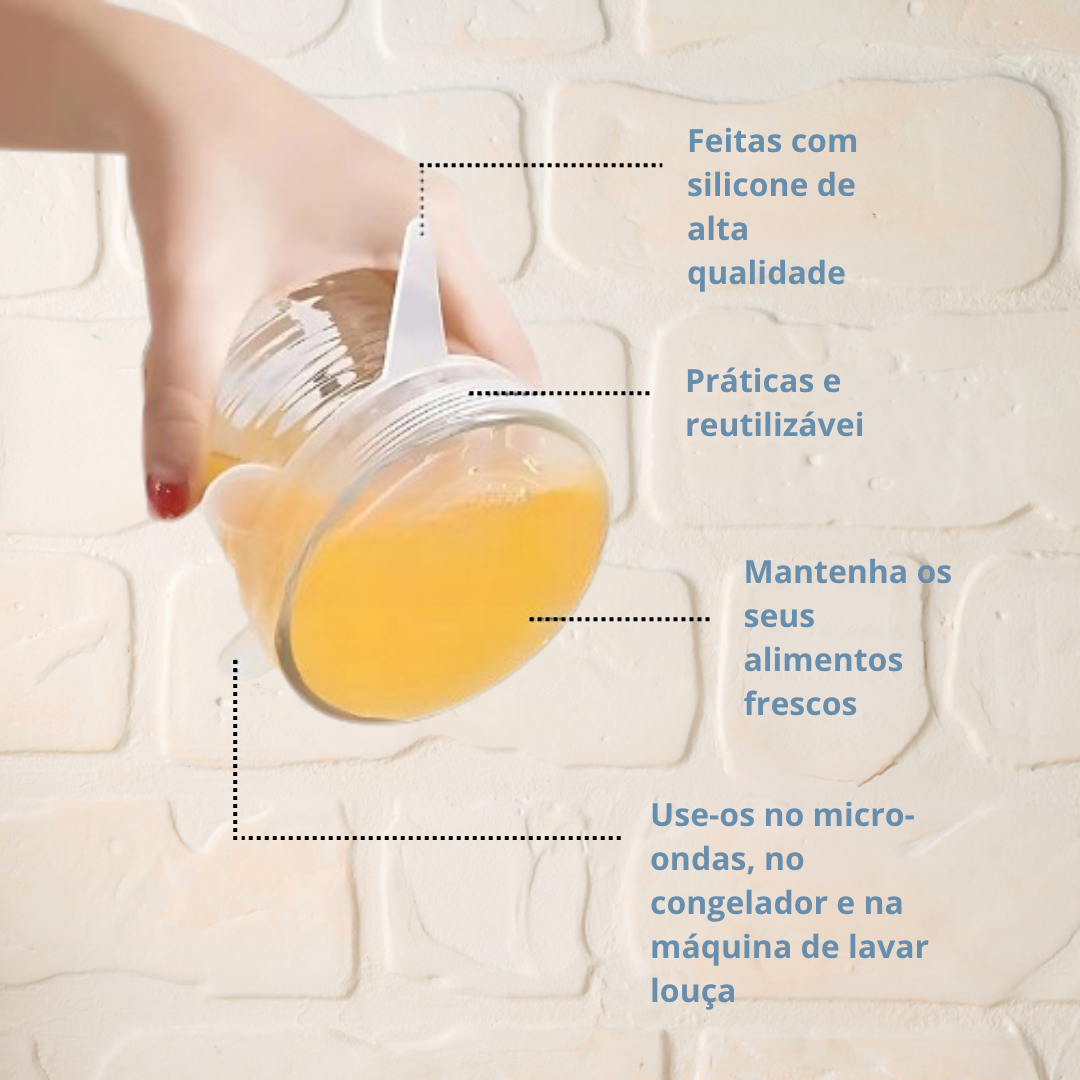 O seu design extensível e flexível permite ajustá-las a recipientes redondos, quadrados ou ovais, mantendo sempre uma vedação hermética.